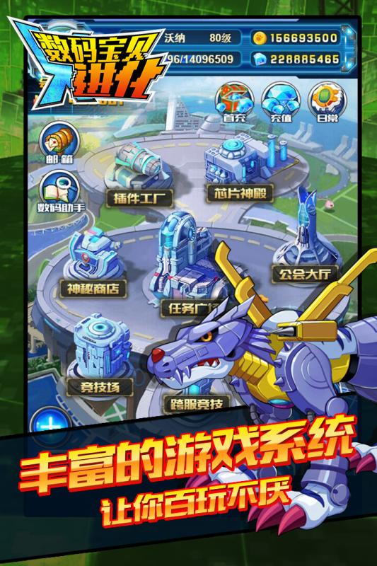 1.数码宝贝x进化采用了精美的画面表现技术和复杂的游戏系统,为玩家提供了一个既熟悉又全新的数码世界。游戏中不但有丰富的数码宝贝收集元素,还拥有独特的进化系统,玩家能够根据数码宝贝的成长途径,选择不同的进化路线,让它们变得更强。
